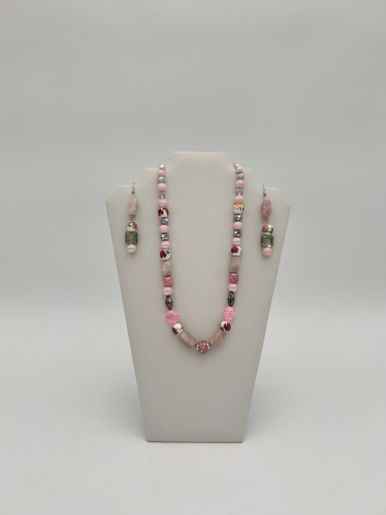 Designed with a blend of pink jewelry beads, faux pink pearls and glassy white beads that have a pink flower pattern on them. Our beautiful masterpiece is perfect to wear for a special occasion or to make you feel more sophisticated.