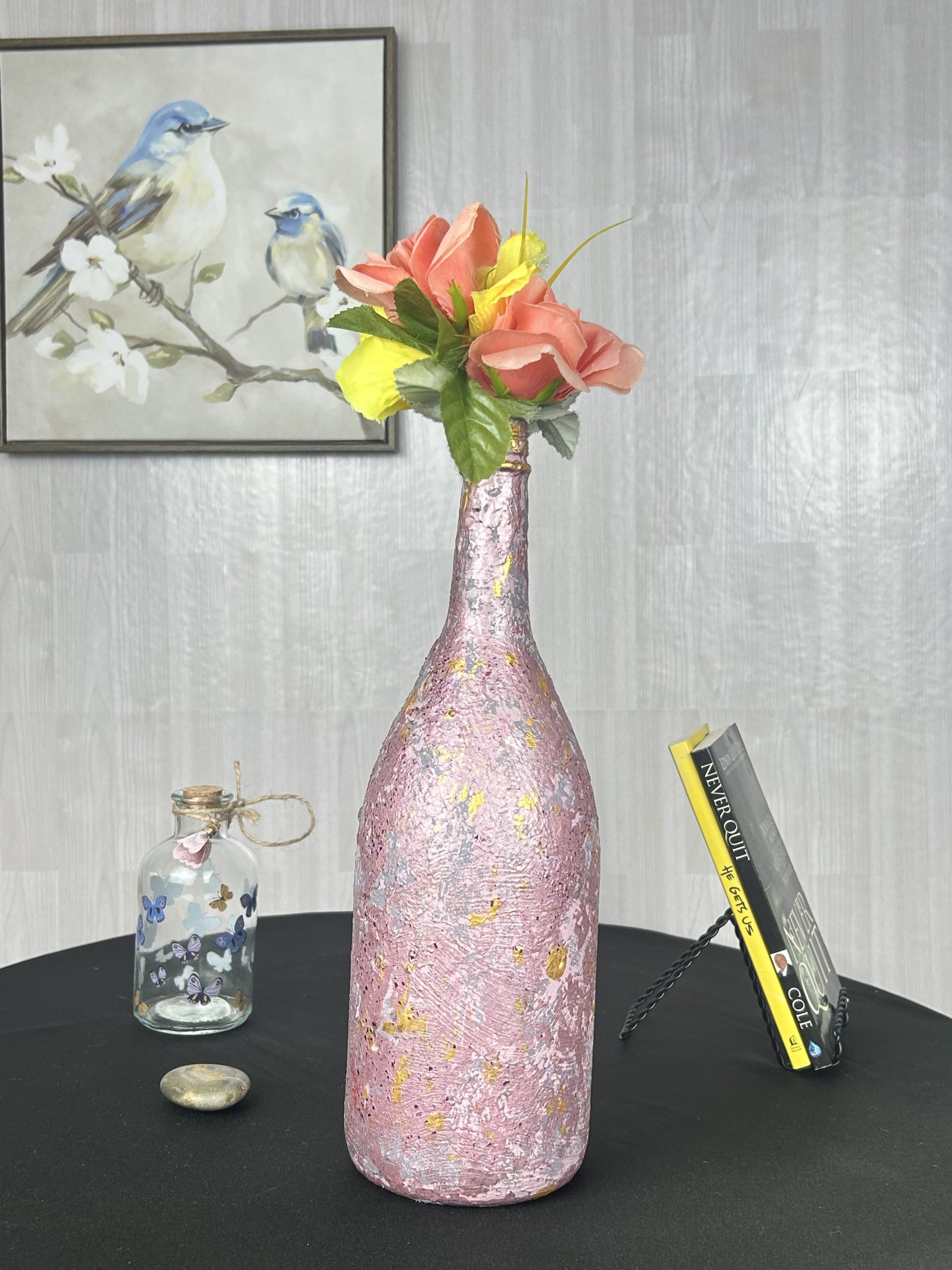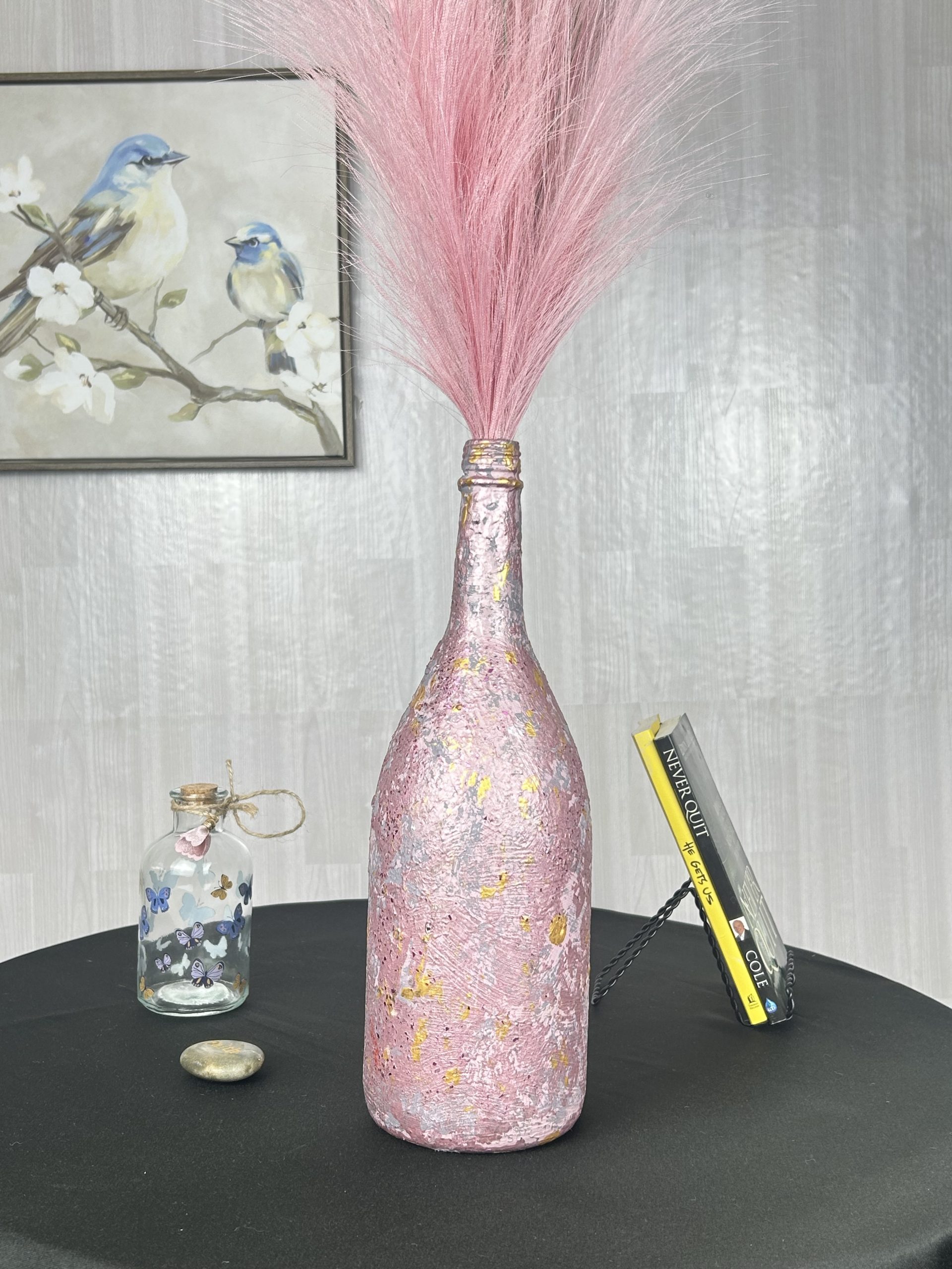Add inspiration and a touch of glam to your living space with our hand painted Blush Pink Floral Vase. An upcycled wine bottle turned into a fabulous glass vase designed to complete a fun, upbeat theme.