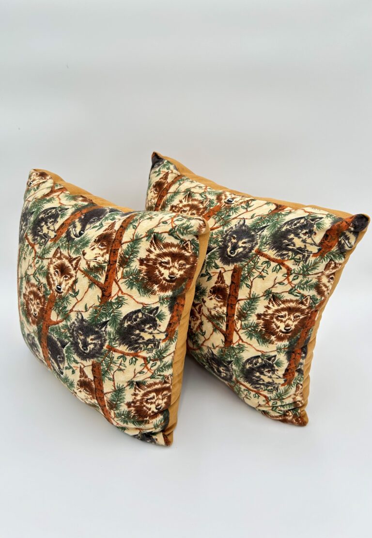 This warm brown, suede pillow set designed with beautiful black and brown wolves in between forest trees as the print adds instant appeal to any room you place it in. It’s handmade style, cozy texture and never before seen “wolves in the forest” fabric makes it a one of a kind decorative throw pillow set.
