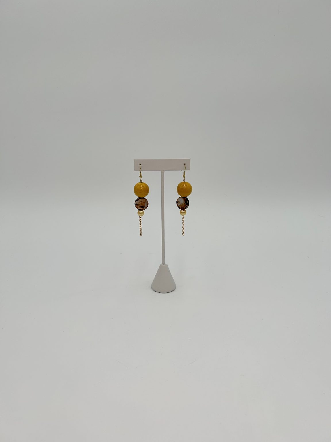 These classy earrings were created with a large and glossy bronze bead, a brown and tan jewelry bead and a small gold bead all nicely stacked on top of each other to create a gorgeous drop effect. They possess a special quality that allows them to complete an elegant look, but also everyday attire.