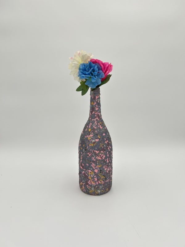 Our upcycled wine glass bottle is carefully crafted into an impressive speckled vase with a paint technique of dark gray covered in pink and yellow spots, and minor traces of silver. This breathtaking vase not only adds creativity. It also brings a sense of interest to your home.