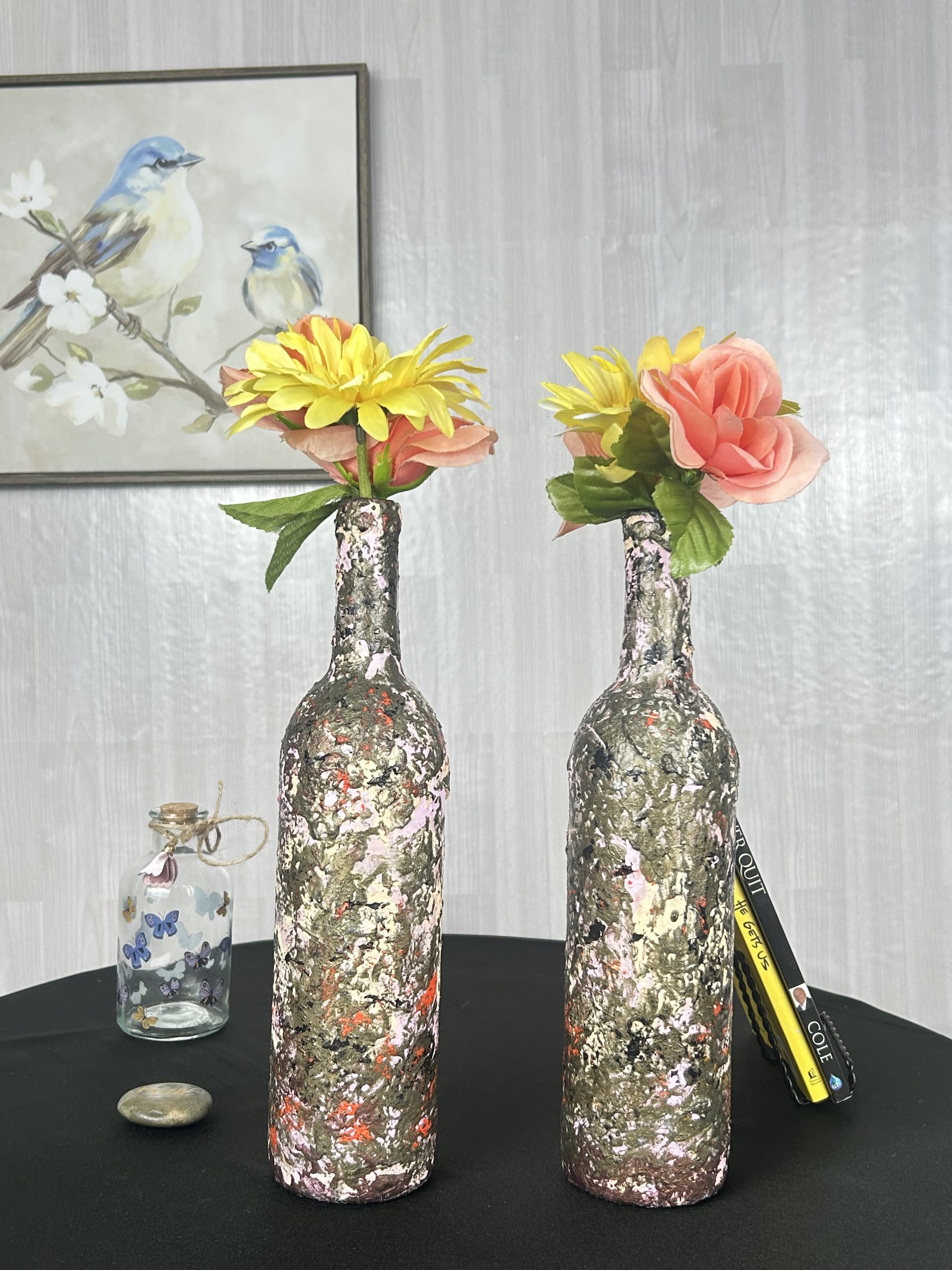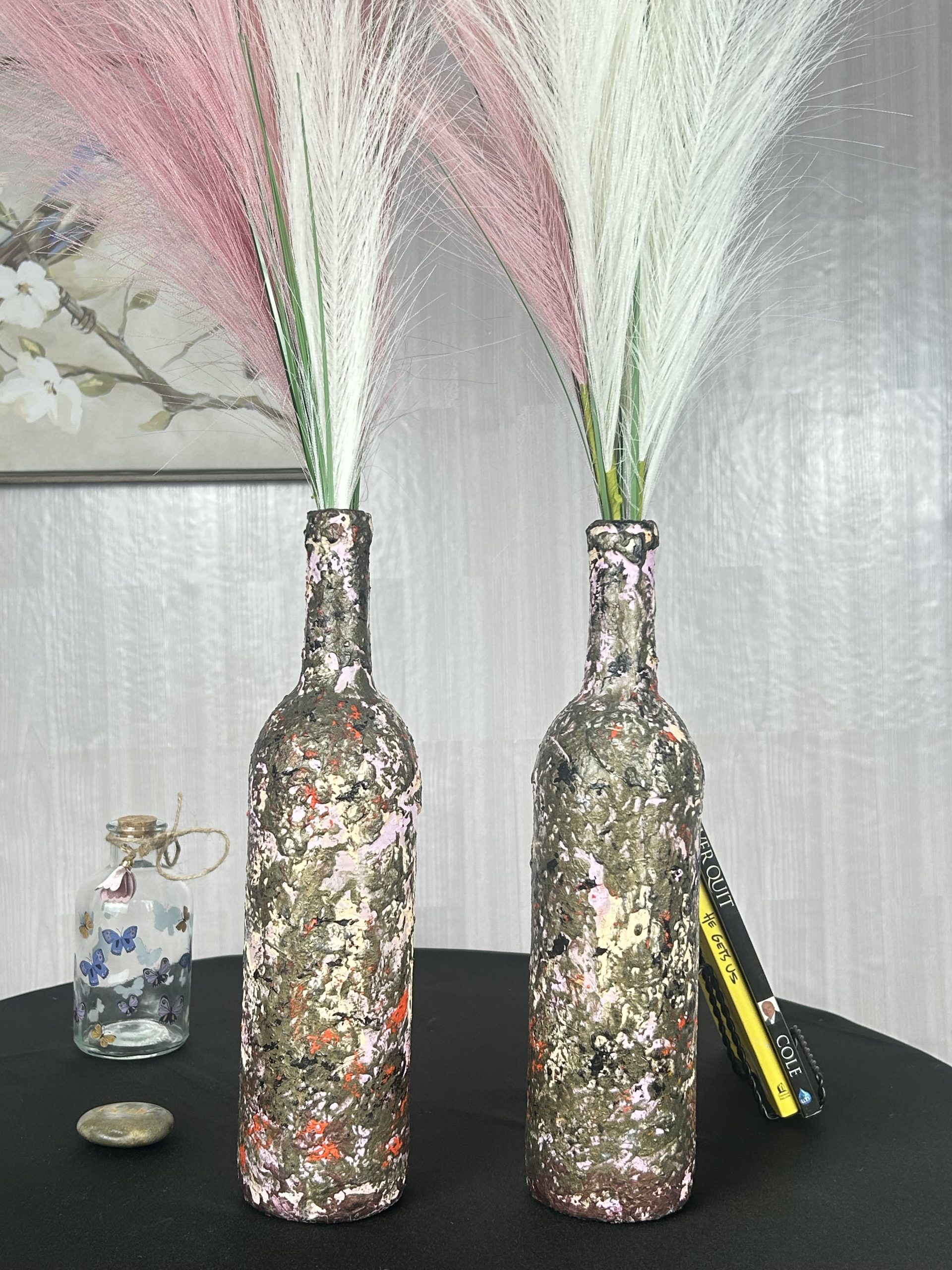 Bring a touch of creativity and flare to your living space with our hand painted Sepia Twirl Decorative Vase Set of 2 for fine art lovers. Twin wine bottle glasses upcycled into breathtaking multicolor vases. Perfect to display as unique decorative pieces in your home.