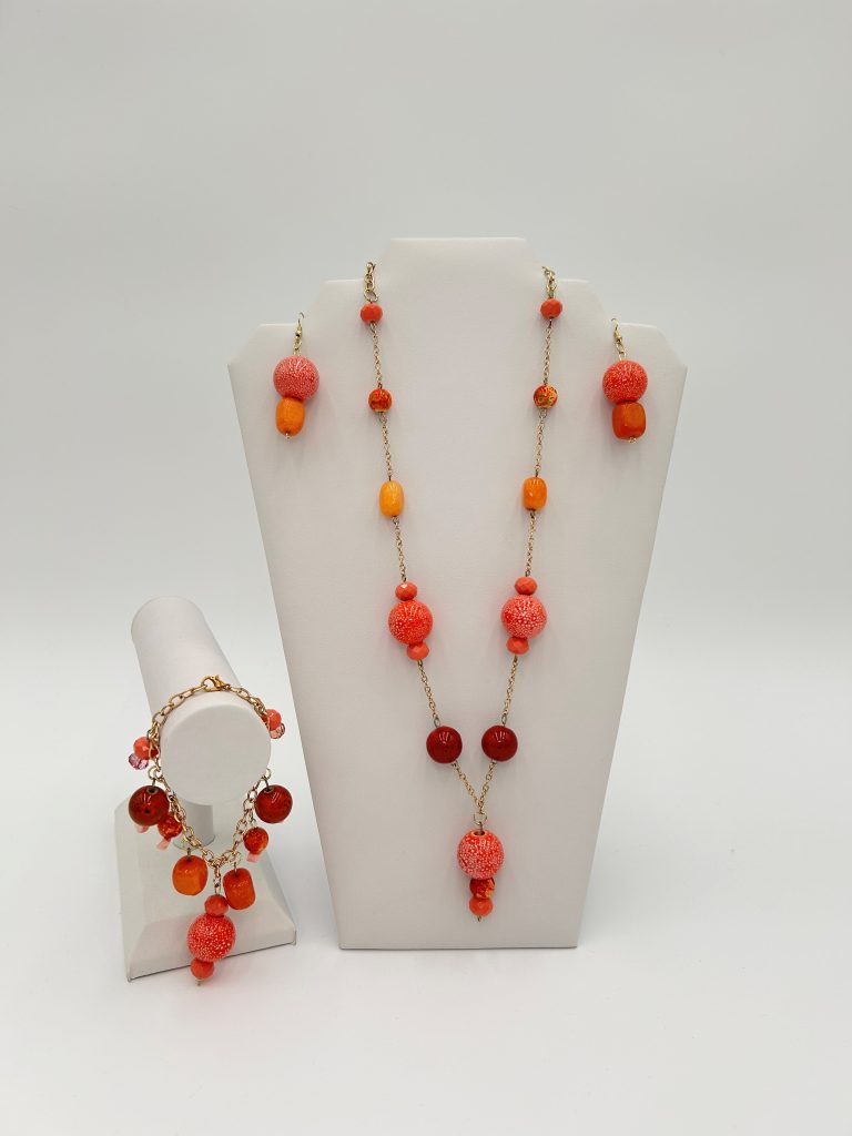 Experience the perfect combination of boho chic and contemporary style with our handmade Sorbet Orange Necklace Set. A gorgeous and vibrant jewelry set that comes with a beaded necklace, matching earrings and a bracelet.