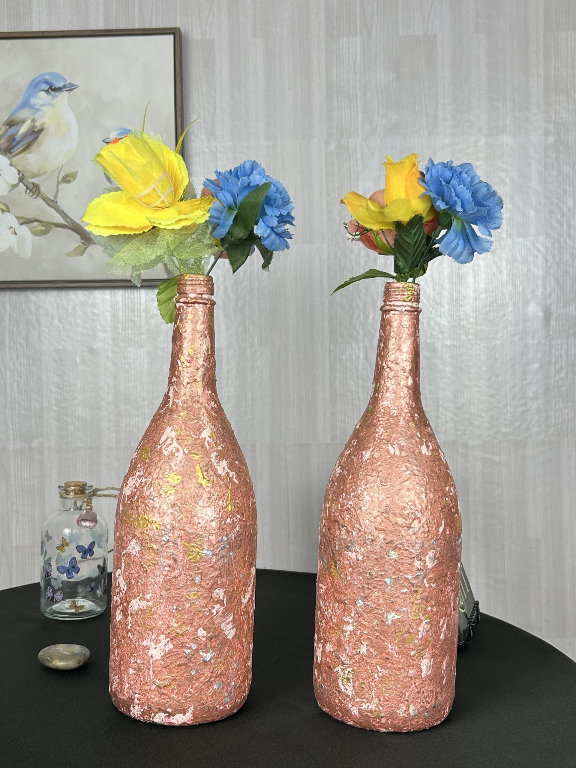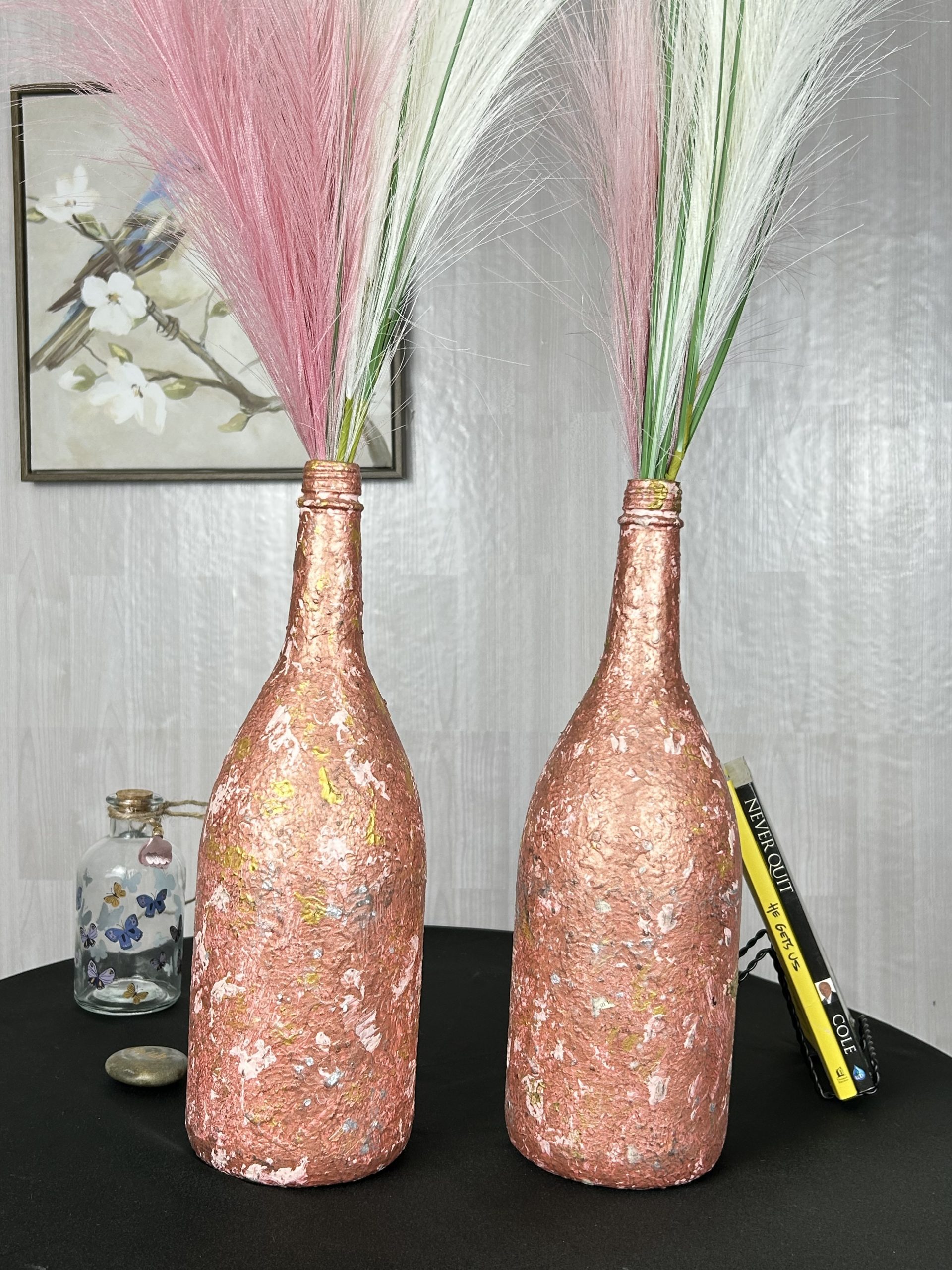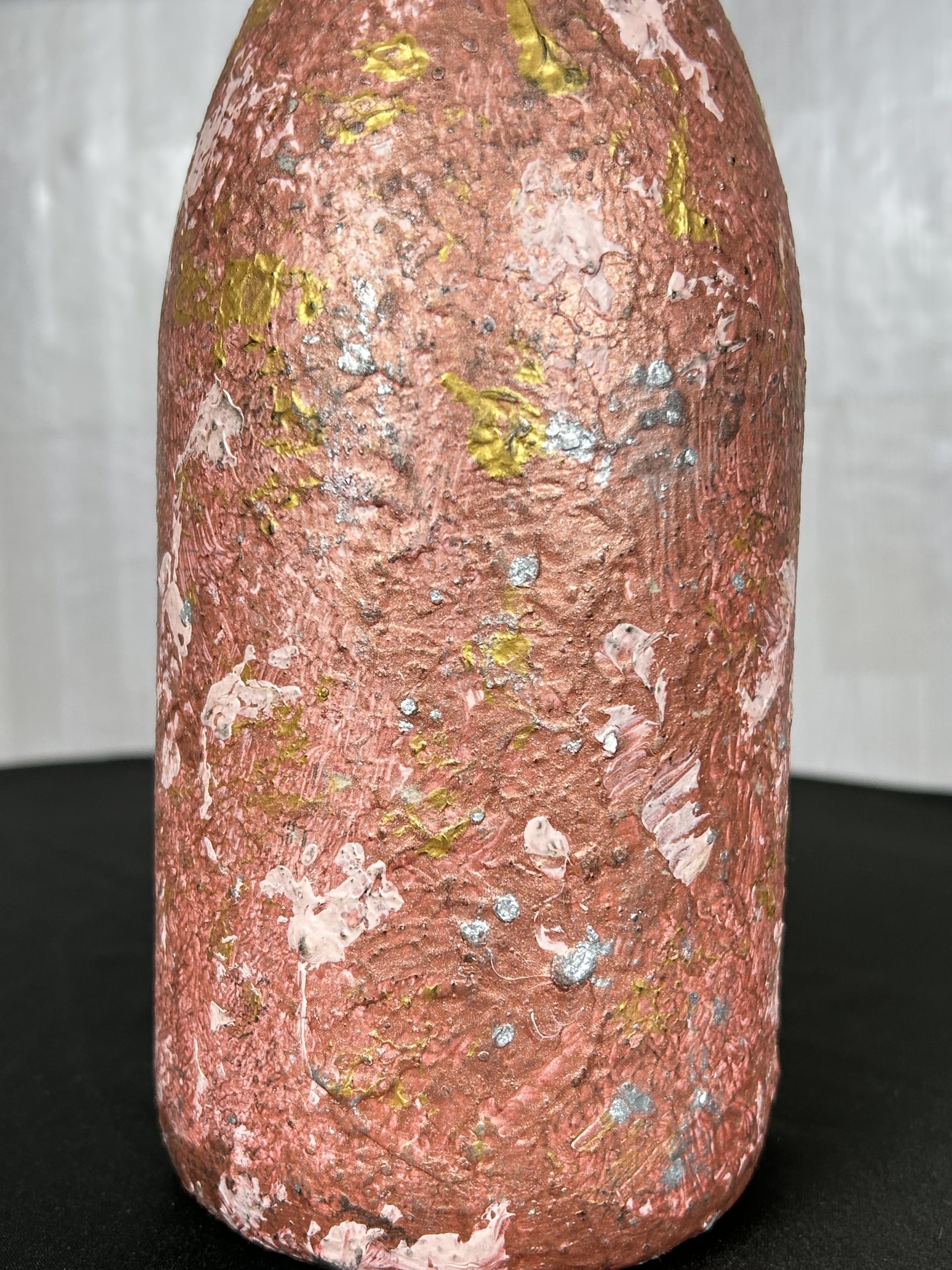 Take joy in bridging art and femininity together with our hand painted Sparkly Pink and Gold Vase Set of 2. Twin large upcycled wine bottles styled as a dainty vase set for a creative who loves pop art decorating.